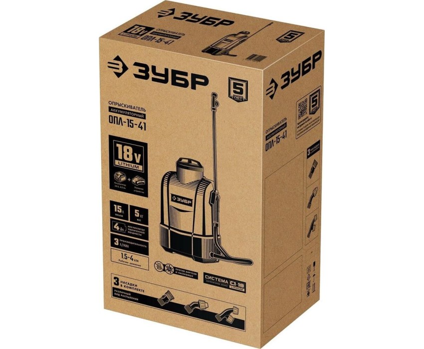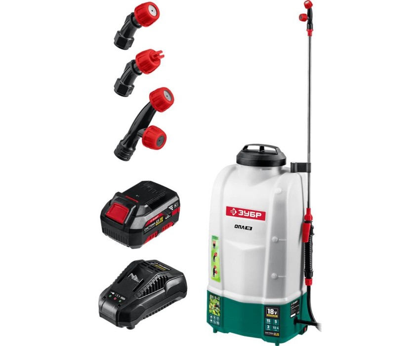 Опрыскиватель ЗУБР ОПЛ-15-41 15 л бак, 1 АКБ (4Ач), 5 кг опрыскиватель аккумуляторный, Li-Ion 18В
