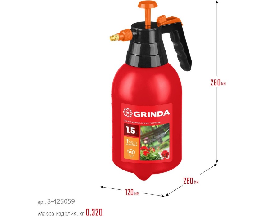 Опрыскиватели GRINDA надежны и долговечны. Удобны в работе, опрыскивают качественно. Преимущества -Регулировка струи, -Колба из полиэтилена, Колба из полиэтилена Использование распыление жидкостей мелкими каплями за счет давления воздуха