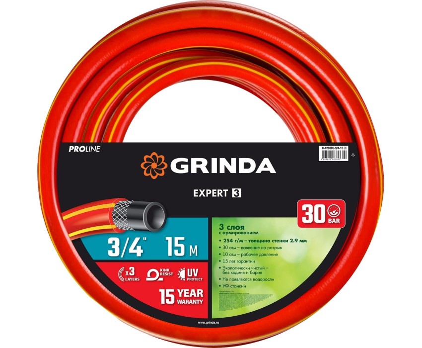 GRINDA EXPERT 3, 3/4″, 15 м, 30 атм, трёхслойный, армированный, поливочный шланг, PROLine (8-429005-3/4-15)