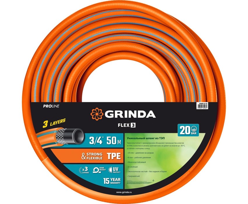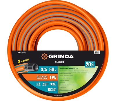 GRINDA FLEX 3, 3/4″, 50 м, 20 атм, из термоэластопласта, трёхслойный, армированный, гибкий, поливочный шланг, PROLine (429008-3/4-50)