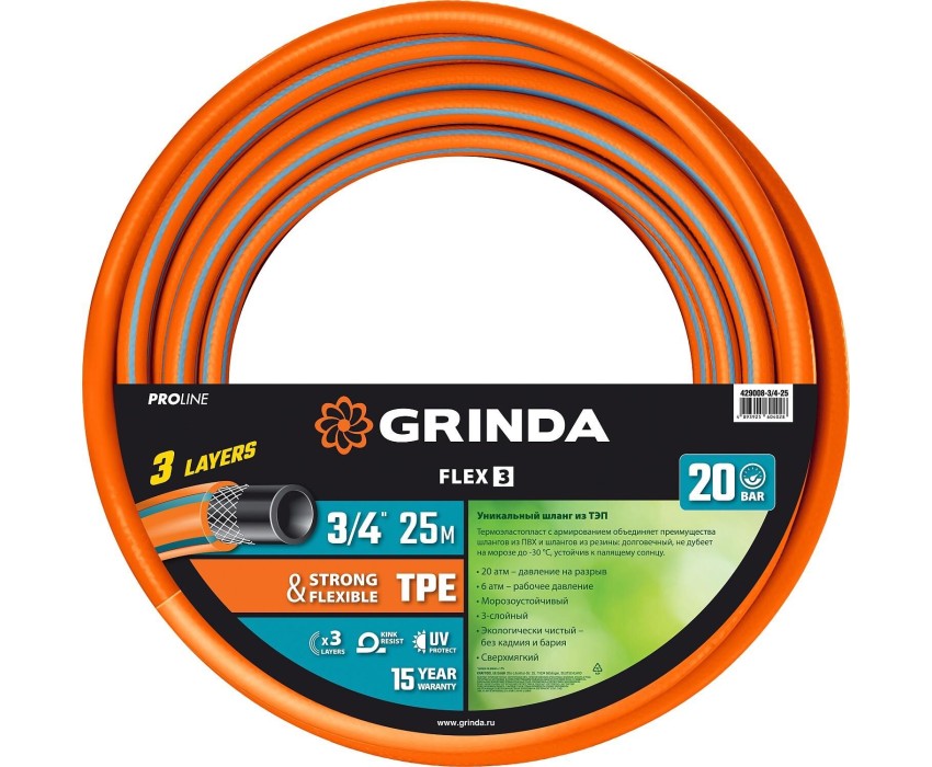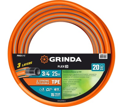 GRINDA FLEX 3, 3/4″, 25 м, 20 атм, из термоэластопласта, трёхслойный, армированный, гибкий, поливочный шланг, PROLine (429008-3/4-25)