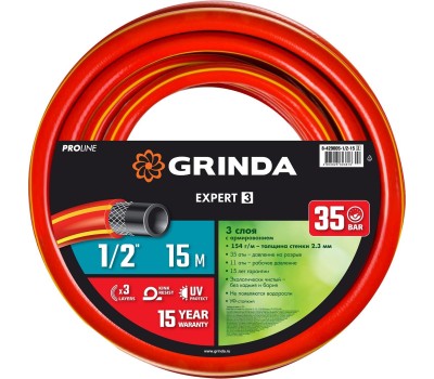 GRINDA EXPERT 3, 1/2″, 15 м, 35 атм, трёхслойный, армированный, поливочный шланг, PROLine (8-429005-1/2-15)