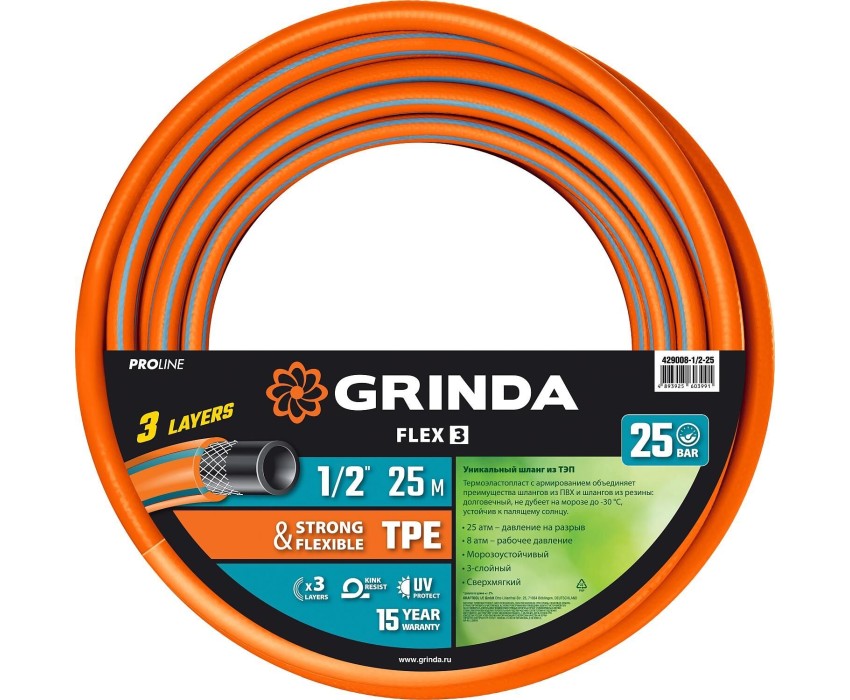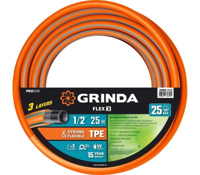 GRINDA FLEX 3, 1/2″, 25 м, 25 атм, из термоэластопласта, трёхслойный, армированный, гибкий, поливочный шланг, PROLine (429008-1/2-25)