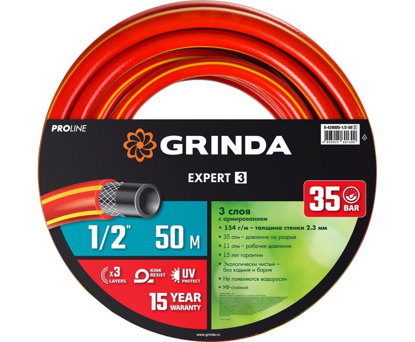 GRINDA EXPERT 3, 1/2″, 50 м, 35 атм, трёхслойный, армированный, поливочный шланг, PROLine (8-429005-1/2-50)