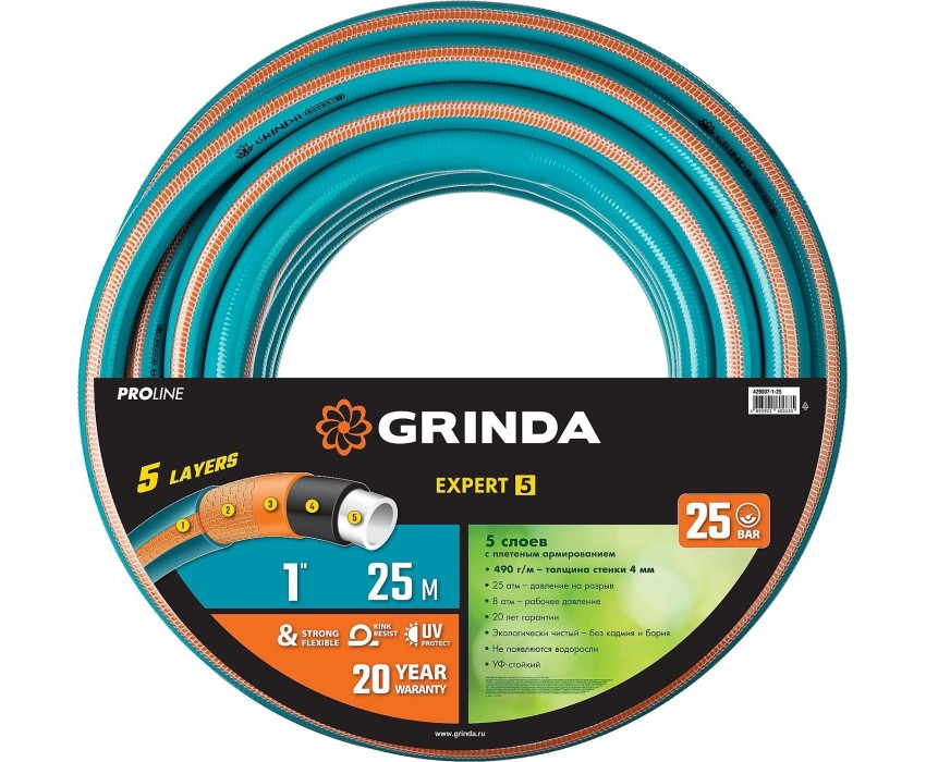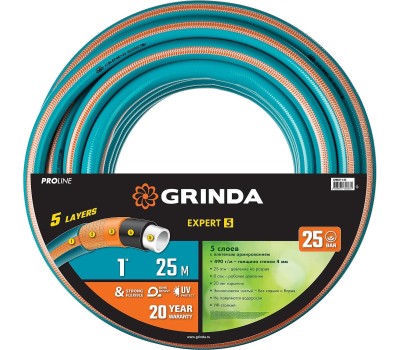 GRINDA EXPERT 5, 1″ 25 м, 25 атм, пятислойный, текстильное армирование, поливочный шланг, PROLine (429007-1-25)