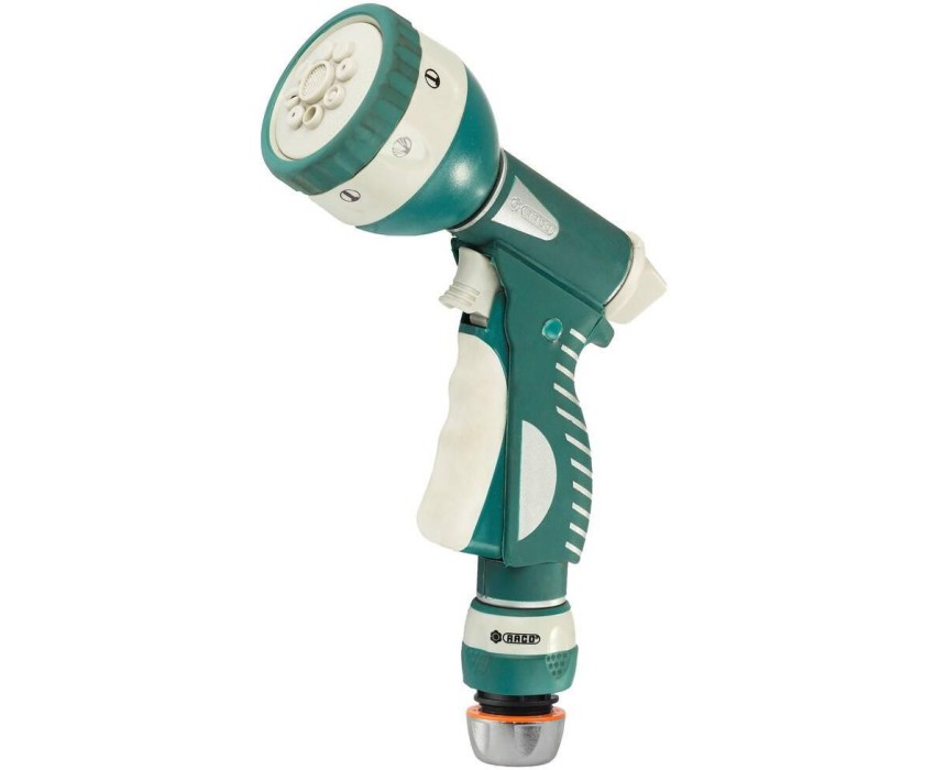 Поливочные пистолеты-распылители RACO Profi Plus это продукт объединения новейших технологий с современным дизайном, конечным результатом которого являются инструменты класса ″люкс″. Обладают наивысшим качеством, самым длительным сроком службы и уровнем комфорта в использовании. Преимущества -Усиленный металлический корпус с антикоррозионной обработкой придает пистолету исключительную прочность и надёжность., -Защитное кольцо изготовлено из мягкой термопластичной резины., -Запатентованные курок-фиксатор и ручка покрыты специальной термопластичной резиной для предотвращения проскальзывания в руке., -Кнопка для снятия фиксации курка., -Регулятор напора струи, -Ребристое покрытие рукоятк Защитное кольцо изготовлено из мягкой термопластичной резины. Запатентованные курок-фиксатор и ручка покрыты специальной термопластичной резиной для предотвращения проскальзывания в руке. Кнопка для снятия фиксации курка. Регулятор напора струи Ребристое покрытие рукоятки из термопластичной резины защищает от проскальзывания. Восемь режимов работы - мягкая струя, водяной конус, аэрирование, жесткая струя, слабая струя, душ, вертикальный полив, плоская струя. В комплект входит соединитель Profi Plus на 1/2″. Использование Применяется для всех типа полива, мойки и очистки.