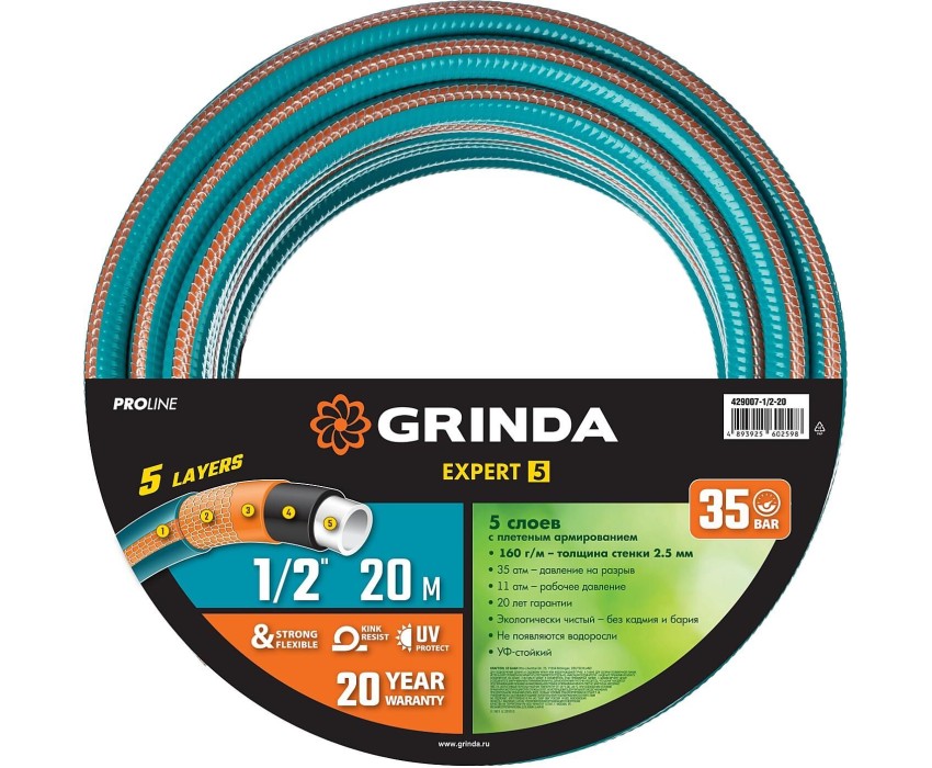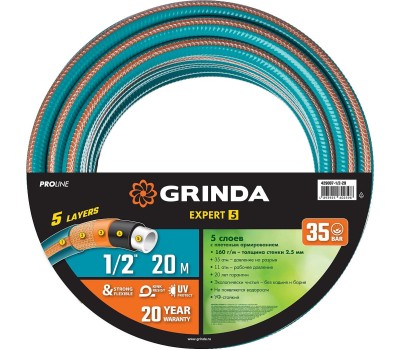 GRINDA EXPERT 5, 1/2″ 20 м, 35 атм, пятислойный, текстильное армирование, поливочный шланг, PROLine (429007-1/2-20)
