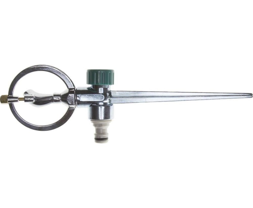 Круговые распылители отлично подходят для полива деревьев, высоких кустарников и газонов. Преимущества -Изготовлен из цинкового сплава и не подвержен коррозии благодаря хромированной поверхности, -Распылитель снабжен двумя соединительными гнездами (быстросъёмное, ¾″), что позволяет использовать его в цепочке из нескольких распылителей., -Обеспечивает полив участка площадью до 95 м²., -Надежно фиксируется в почве металлической пикой., Распылитель снабжен двумя соединительными гнездами (быстросъёмное, ¾″), что позволяет использовать его в цепочке из нескольких распылителей. Обеспечивает полив участка площадью до 95 м². Надежно фиксируется в почве металлической пикой. Использование Применяется для стационарного полива растений.