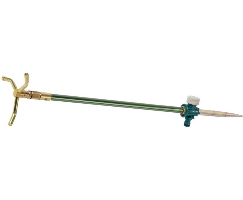 Круговой распылитель RACO изготовлен из латуни, алюминия и стали. При открученном резьбовом соединении распылительная головка, вращаясь под напором воды, самостоятельно раздвигает удлинитель для полива высоких растений. Преимущества -Имеет три латунных сопла с повышенной стойкостью к коррозии., -Распылитель снабжен двумя соединительными гнездами (быстросъёмное, ¾″), что позволяет использовать его в цепочке из нескольких распылителей., -Легкий и прочный алюминиевый удлинитель не подвержен коррозии и может быть отрегулирована на высоту 53 - 84 см., -Распылительная головка, вращаясь под напором воды, самостоятельно раздвигает уд Распылитель снабжен двумя соединительными гнездами (быстросъёмное, ¾″), что позволяет использовать его в цепочке из нескольких распылителей. Легкий и прочный алюминиевый удлинитель не подвержен коррозии и может быть отрегулирована на высоту 53 - 84 см. Распылительная головка, вращаясь под напором воды, самостоятельно раздвигает удлинитель до 84 см. Обеспечивает полив участка площадью до 115 - 135 м². Металлическая пика надежно фиксирует распылитель в почве. Использование Применяется для стационарного полива растений.