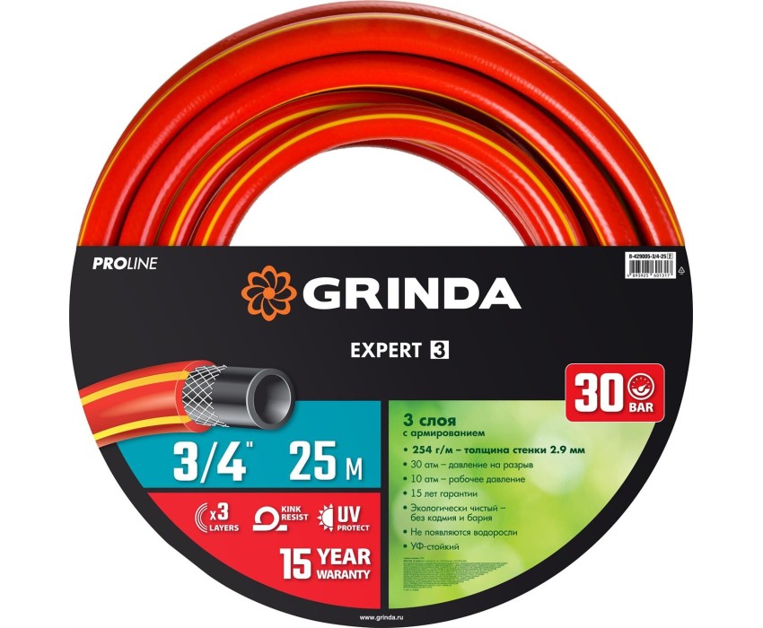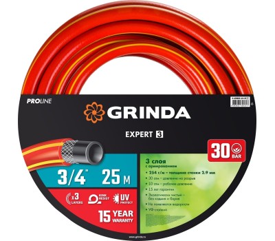GRINDA EXPERT 3, 3/4″, 25 м, 30 атм, трёхслойный, армированный, поливочный шланг, PROLine (8-429005-3/4-25)