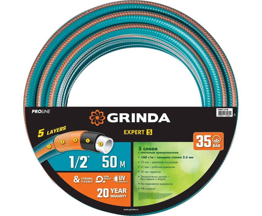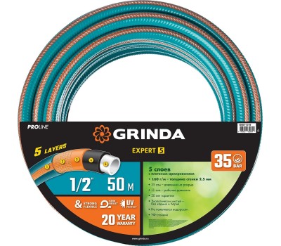 GRINDA EXPERT 5, 1/2″, 50 м, 35 атм, пятислойный, текстильное армирование, поливочный шланг, PROLine (429007-1/2-50)