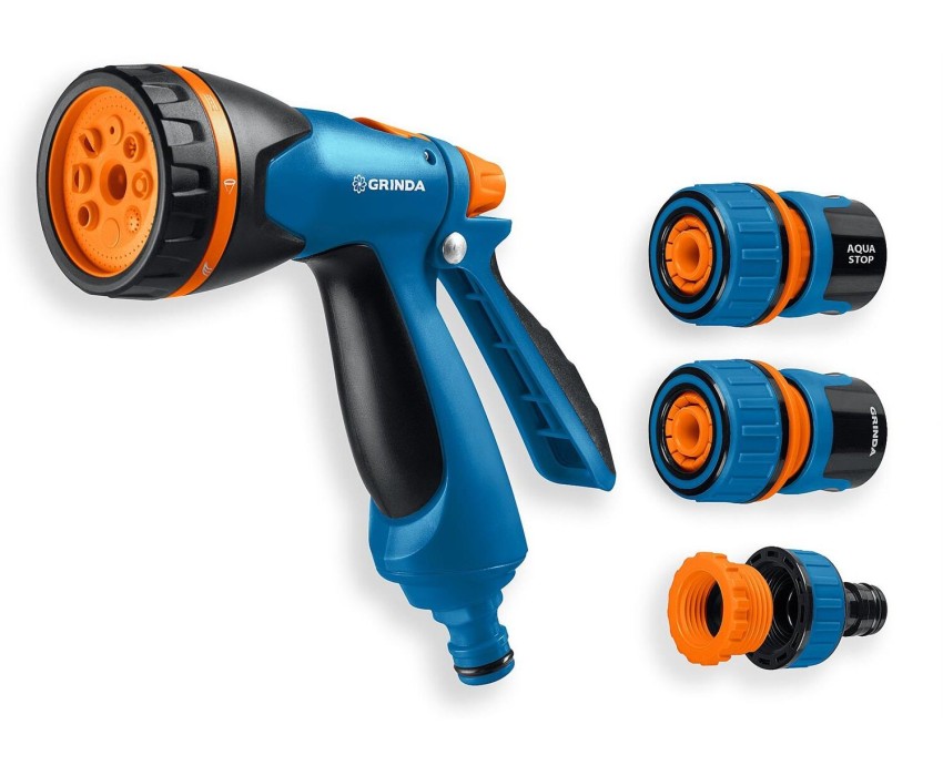 Поливочный набор GRINDA очень удобен в применении. Обеспечивает быстрое, простое и качественное подключение к практически любой поливочной системе без дополнительных аксессуаров. Преимущества Комплектация набора позволяет с помощью садового шланга 3/4″ легко и быстро собрать поливочную линию и подключить ее к крану или водопроводной трубе с внешней резьбой 1/2″-3/4″. -Использование высококачественных материалов гарантирует продолжительный срок службы., Фиксатор непрерывного полива 8 режимов полива: мягкая струя, конус, аэрирование, жесткая струя, слабая струя, душ, вертикальный полив, плоская струя Использование Применяется для всех типа полива, мойки и очистки.