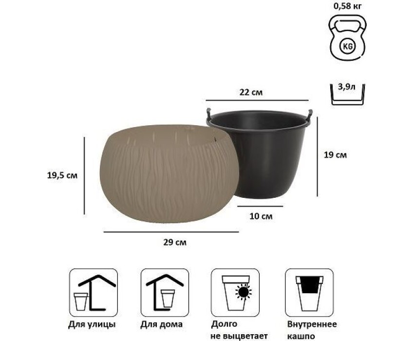 Кашпо для цветов Sandy Bowl является замечательным украшением садового интерьера, дома, зоны отдыха. Оно обладает повышенной стойкостью к высоким и низким температурам, а также к различным механическим повреждениям. Кашпо для цветов Sandy Bowl состоит из двух предметов: внутренней емкости, куда сажают растение, и декоративной емкости. • Комплектация: 2 предмета (внутренняя емкость + декоративная емкость) • Размер (ДМхВ): 290х190 мм • Объемы: 3,9 л • Цвет: мокко • Материал: пластик • Вес брутто: 0,58 кг • Количество в упаковке: 4 штуки • Производитель: Prosperplast • Страна: Польша