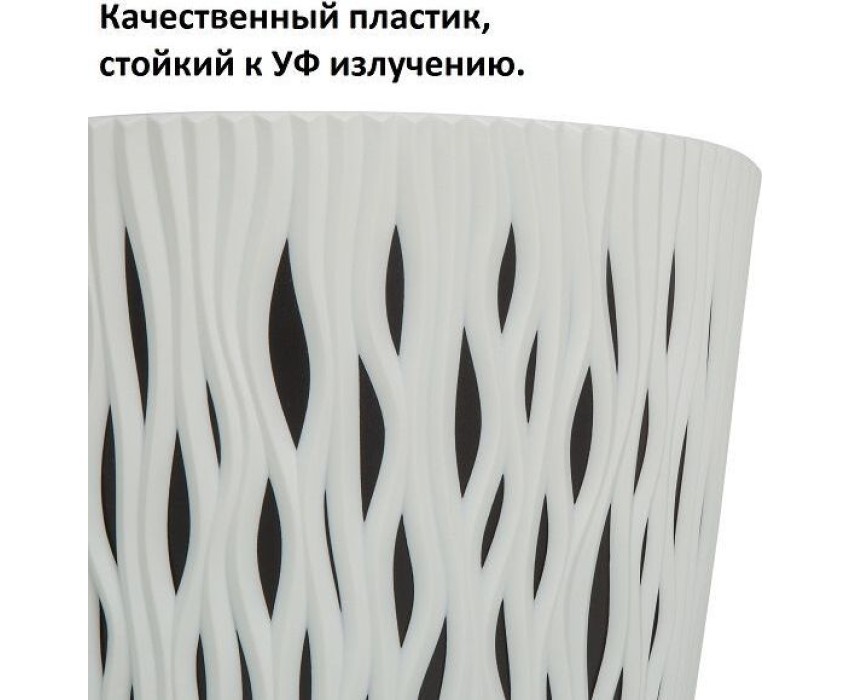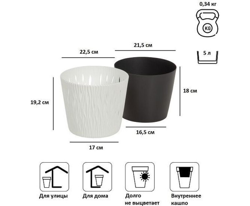 Кашпо для цветов Sandy Round является замечательным украшением садового интерьера, дома, зоны отдыха. Благодаря прочному пластику изделие обладает устойчивостью к ультрафиолетовым лучам. Кашпо для цветов Sandy Round состоит из двух предметов: внутренней емкости, куда сажают растение, и декоративной емкости. • Комплектация: 2 предмета (внутренняя емкость + декоративная емкость) • Размер (ДМхВ): 225х192 мм • Объемы: 5 л • Цвет: белый • Материал: пластик • Вес брутто: 0,338 кг • Количество в упаковке: 5 штук • Производитель: Prosperplast • Страна: Польша