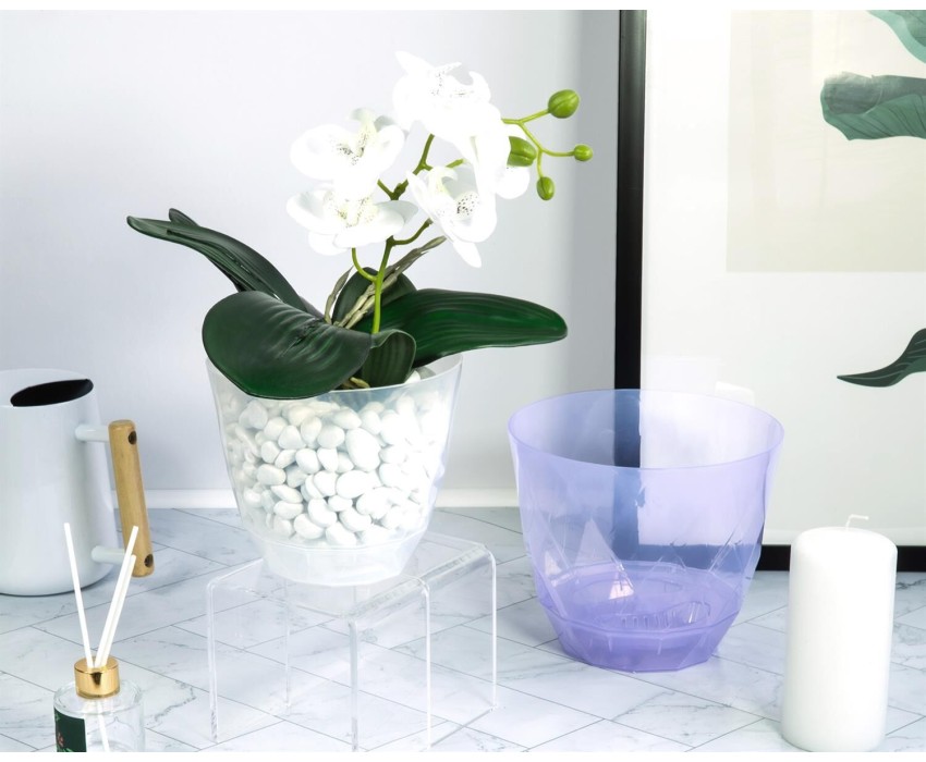 Прозрачный горшок объёмом 2,3л и диаметром 17,5см идеален для выращивания орхидей. Прозрачные стенки, повторяющие рельеф огранённого кристалла, пропускают большой объём света к корням орхидей. Горшок состоит из корпуса с большим количеством дренажных отверстий и глубокого поддона. Орхидеи не любят застоя воды в корнях, и данный горшок удовлетворит их потребности. Воздух, циркулирующий между кашпо и блюдцем, обеспечивает проветривание корней. Производится в России из долговечного на 100% перерабатываемого полипропилена.