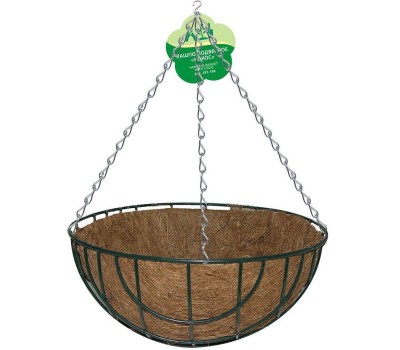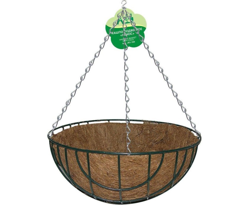 Подвесное кашпо используется для домашних и садовых растений. Кокосовый наполнитель не требует использования цветочного горшка. Кашпо хорошо смотрится, в нем не застаивается влага и растения дышат. Может использоваться как снаружи, так и внутри помещения. Подвешивается на трех цепочках, которые объединены одним удобным крючком. Изготовлено: каркас, цепочки и крюк из металла с покрытием, корзина из кокосового волокна. Диаметр 35 см, глубина 18 см. ВНИМАНИЕ Не лейте слишком много воды, чтобы кокосовая корзина не протекла.