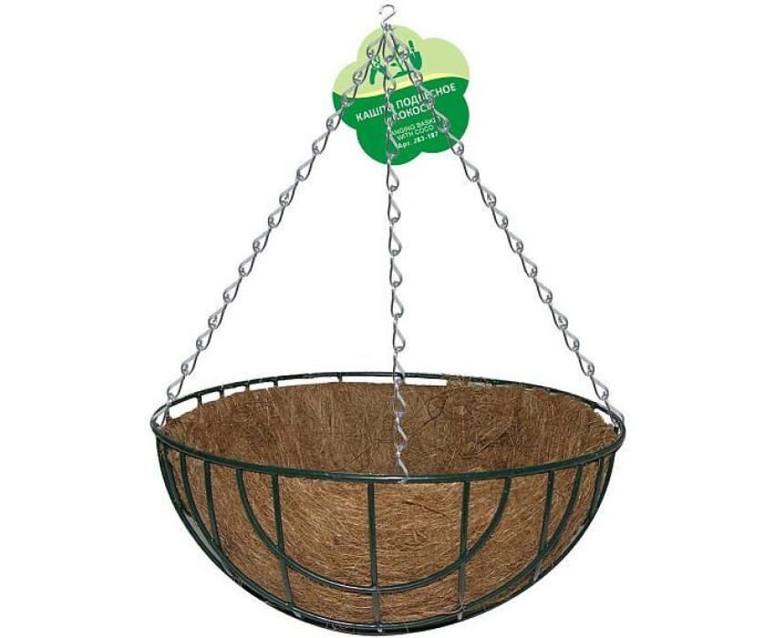 Подвесное кашпо «Кокос» предназначено для размещения растений. Наличие кокосового наполнителя не требует использования цветочного горшка. Они хорошо смотрятся и хороши для растений, так как в них не застаивается влага и они дышат. Может использоваться как снаружи, так и внутри помещения. Подвешивается на трех цепочках, объединенных удобным крюком. Изготовлено: каркас, цепочки и крюк из металла с покрытием, корзина из кокосового волокна. Диаметр 25 см, глубина 13 см. ВНИМАНИЕ! Избегайте перелива растений, во избежание протекания кокосовой корзины.