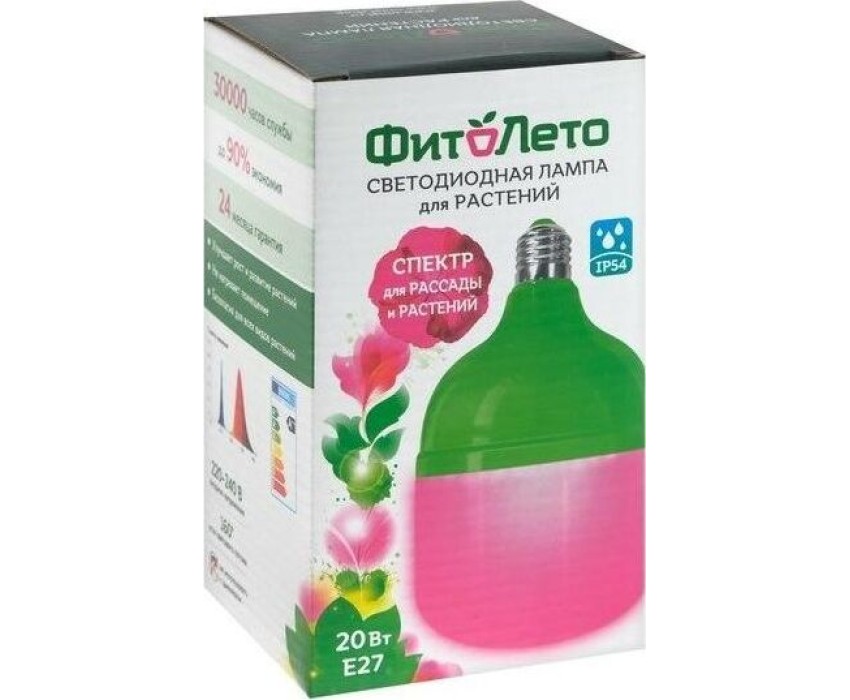 Спектр для рассады и цветения. Входное напряжение, В - 220-240; Высота изделия, мм - 165; Диапазон рабочих температур, °С - от -20 до +45; Класс энергопотребления - A++; Материал корпуса (изделия) - термопластик; Минимальная партия - 1; Мощность, Вт - 20; Срок гарантии, мес. - 24 месяца; Срок годности - не ограничен; Срок службы, ч - 30000; Угол светового потока, ° - 160; Цоколь - Е27