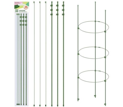 Опора используется для поддержки и фиксации в нужном положении стеблей и кроны растений. Кольцевая опора подойдет как для комнатных растений, так и для растений в саду. Опора устанавливается в цветочный горшок или открытый грунт. Опора состоит из трех колышков и трех прутиков, которые сворачиваются в кольца и фиксируются на колышках при помощи 9 зажимов. Кольца регулируются по ширине и высоте. Опора для цветов создает отличную поддержку для растений придавая им аккуратный, безупречный вид. Изготовлено из металла с порошковым покрытием, пластмассы (полипропилен). Размер: высота 90 см, максимальный диаметр колец 28 см.