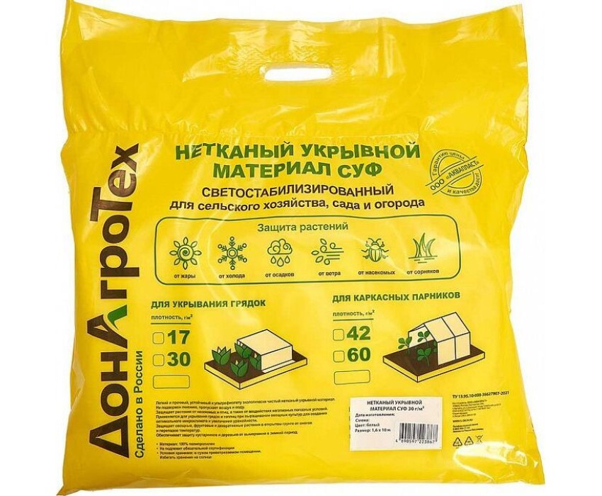 Параметры Длина 10 м Ширина 1,6 м Плотность 30 г/м? Описание Легкий и прочный, устойчивый к ультрафиолету экологически чистый нетканый укрывной материал СУФ светостабилизированный для сельского хозяйства, сада и огорода Не подвержен гниению, пропускает воздух и воду Защищает растения от насекомых и птиц, а также от воздействия негативных погодных условий Применяется для укрывания грядок и теплиц при выращивании овощных культур для создания оптимального микроклимата и увеличения урожайности Защищает овощные, фруктовые и декоративные растения в открытом грунте от ожогов и перепадов температур Обеспечивает защиту кустарников и деревьев от вымерзания в зимний период Материал: 100% полипропилен Цвет: белый Упаковка: пакет Производитель: Россия
