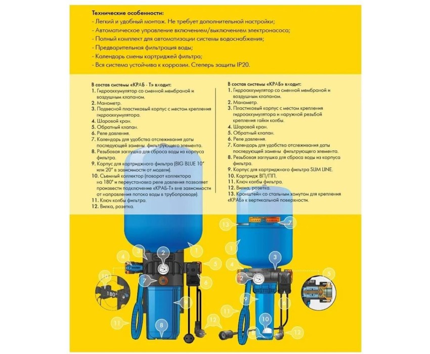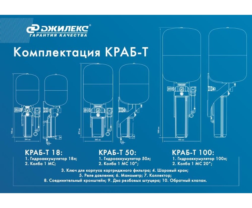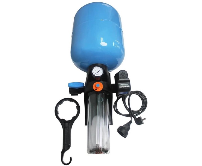 Количестно предметов в комплекте: 10 предметов. Комплектация: Гидроаккумулятор 100 л.; пластм. колба для картридж BIG BLUE 20"; ключ для колбы; манометр; устройство индикации месяца замены фильтрующего картриджа; съемный коллектор, который содержит встроенный шаровой кран с резьбовым патрубком на выходе, обратный клапан с резьбовым патрубком на входе.. Вес: 21090. Диаметр: 1. Страна производства: Российская Федерация. Гарантия: 24 мес.. Цвет: голубой/черный