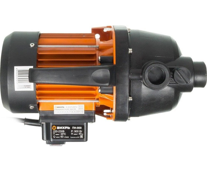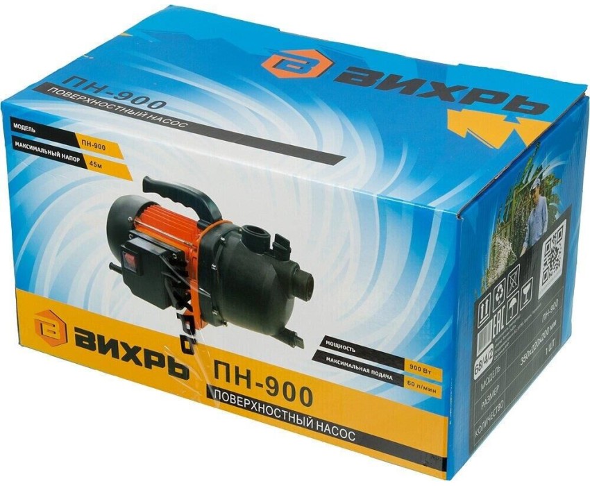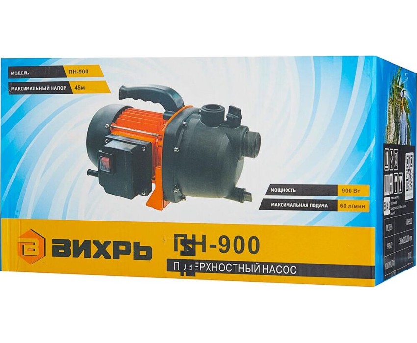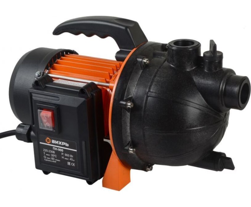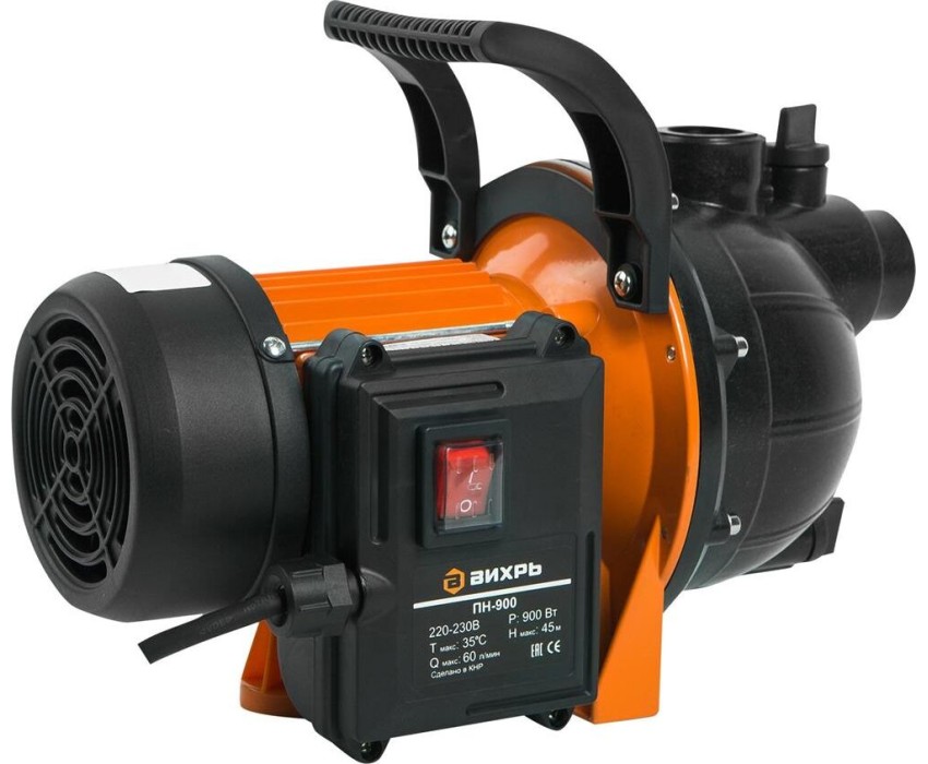 Поверхностный насос ВИХРЬ ПН-900. Мощность, Вт – 900; Тип насоса – центробежный; Максимальный напор, м - 45; Максимальная подача, л/мин – 60; Материал корпуса насоса – пластик;