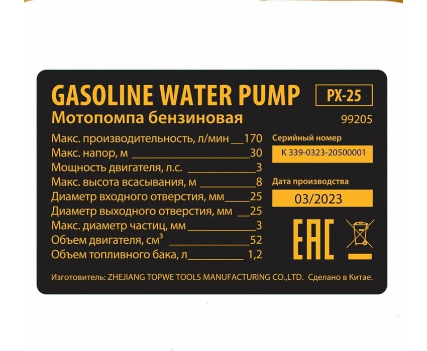 Мотопомпа DENZEL Мотопомпа бензиновая для чистой воды PX25, 52 см3, 1", 170 л/мин, глуб 8 м, напор 30 м Denzel 99205
