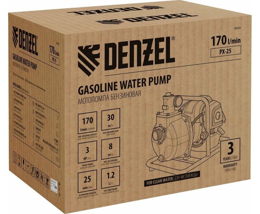 Бензиновая мотопомпа Denzel PX25 99205 с 2тактным двигателем мощностью 52 см3 и производительностью 170 л/мин обеспечивает глубину всасывания 8 м и напор 30 м. Предназначена для перекачивания чистой воды, используется для осушения затопленных подвалов и нижних этажей зданий, бассейнов. Подходит также для организации системы орошения на загородном участке.