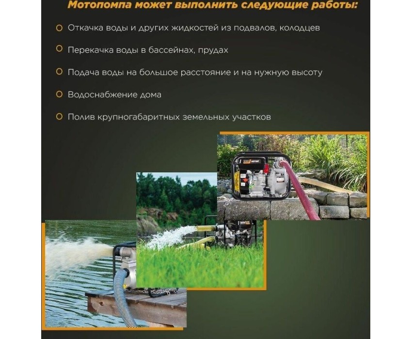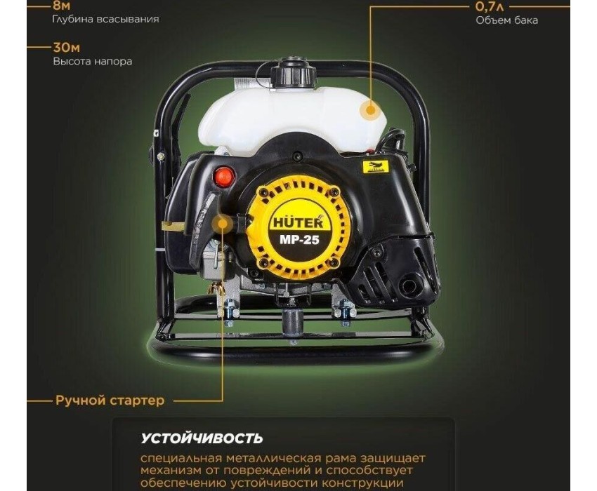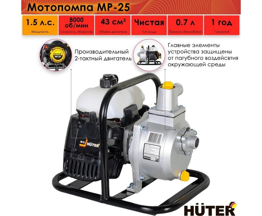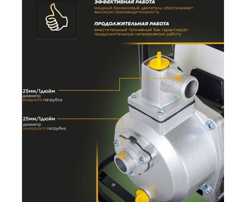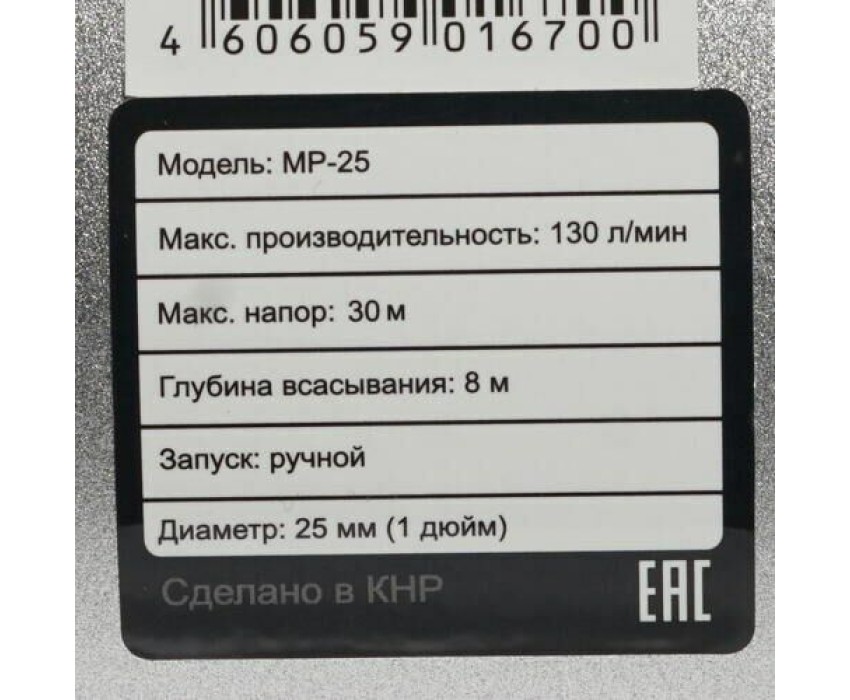 Тип стартера Ручной. Штрихкод EAN-13 4606059016700. Вид топлива Бензин АИ-92 + Масло. Тип мотопомпы центробежная, самовсасываю. Рабочий объем двигателя, см3-43. Скорость оборотов, об/мин 8000. Диаметр входного патрубка, мм/дюйм 25/1. Диаметр выходного патрубка, мм/дюйм 25/1. Макс. производительность, л/мин 130. Объем бака, л 0.7. Тип воды чистая. Масса, кг 7.5. Номинальная мощность двигателя, л.с. 1.5. Глубина всасывания, м 8. Высота напора, м 30.
