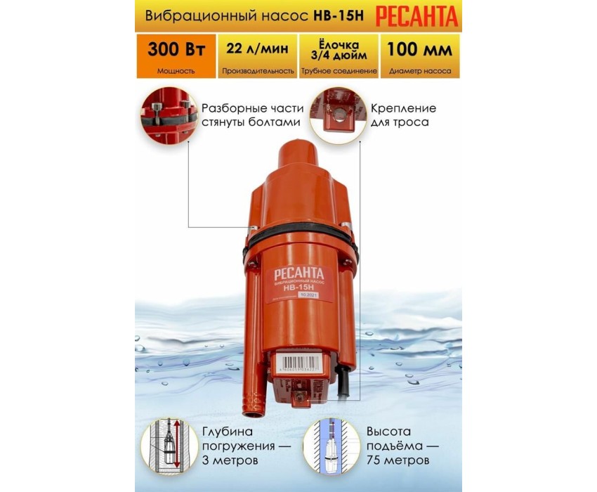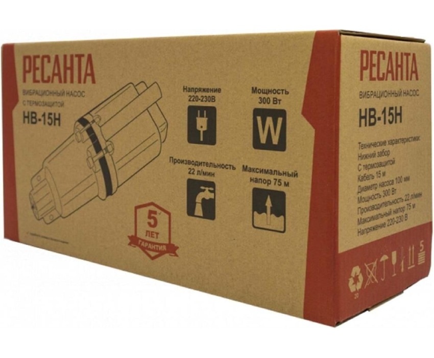 Тип: Насос. Тип по механизму: вибрационный. Максимальная мощность: 300. Максимальная производительность: 1320. Максимальная высота подачи: 75. Максимальное давление: 7.6. Максимальная глубина погружения: 3. Максимальная температура подачи: 35. Набор аксессуаров: отсутствует. Особенности: Гарантийный срок составляет 24 мес. со дня продажи. Расширенная гарантия 60 мес. предоставляется только при условии, если владелец зарегистрирует инструмент в течении 1 мес. с момента покупки на сайте компании Ресанта www.resanta.ru.. Ширина товара: 150. Высота товара: 430. Длина товара: 150. Вес товара: 3.6. Назначение по воде: для чистой воды. Тип по расположению: погружной. Присоединительный размер: 3/4. Длина кабеля: 15. Забор воды: нижний. Комплектация: Вибрационный насос с кабелем питания, шнур, паспорт, упаковка.. Напряжение сети: 220В. Материал корпуса: алюминий. Габариты упаковки (ед) ДхШхВ: 0.31x0.16x0.11. Вес упаковки (ед): 3.73. Диаметр насоса: 100. Для повышения давления: нет. Класс защиты: IPX8. Материал помпы: металл. Работает в экосистеме "умный дом": нет. Тип питания: от сети. Тип по назначению: садовый. Гарантия: 24 мес.. Системы защиты: защита двигателя от перегрева. Тип насоса: садовый, погружной, вибрационный. Максимальная высота: подачи 75 м. Давление: 7.6 Бар. Максимальная глубина погружения: 3 м. Производительность: 1320 л/ч. Назначение: для чистой воды. Мощность: 300 Вт