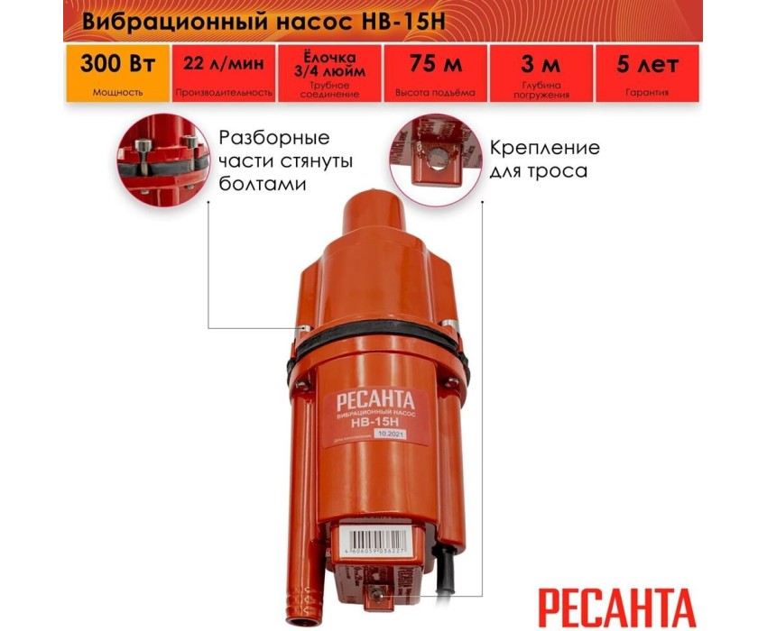 РЕСАНТА Насос садовый НВ-15Н, вибрационный, погружной, 1320л/ч [77/8/4]