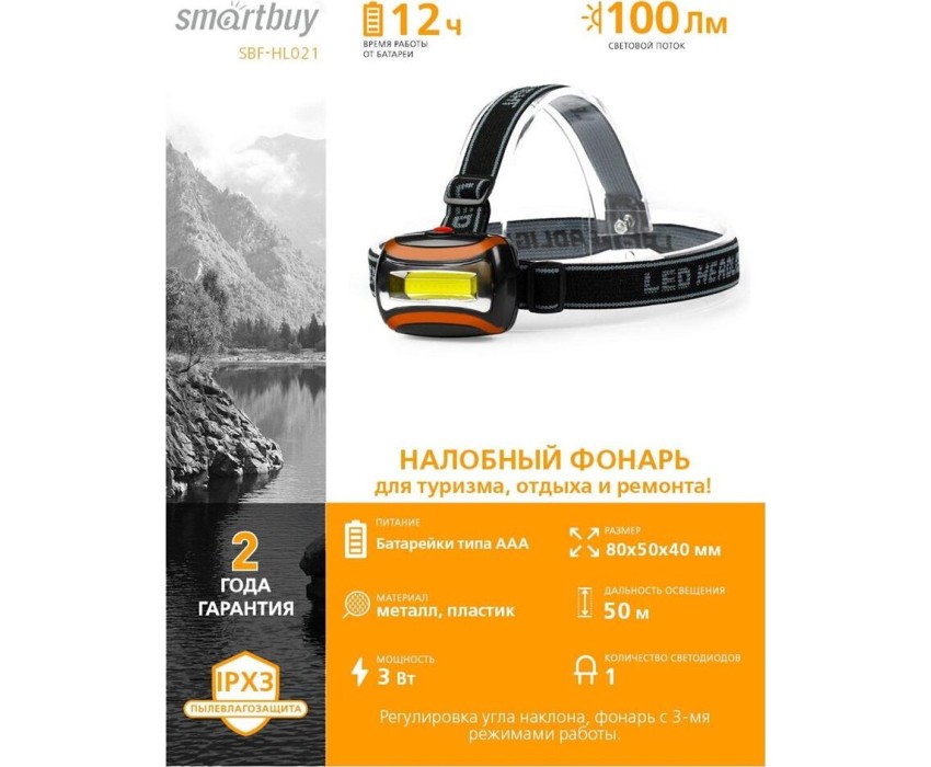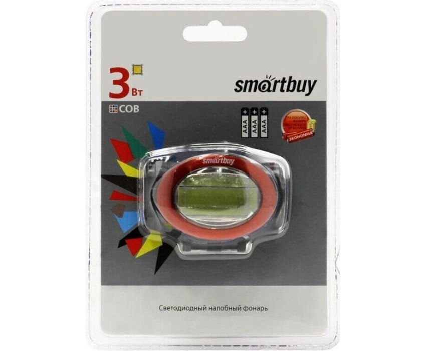 Фонарь налобный Smartbuy SBF-HL021 1 LED COB 3W (100lm), 2 режима, дальность 50м, питание 3хAAA, пластик/металл, черный, SBF-HL021