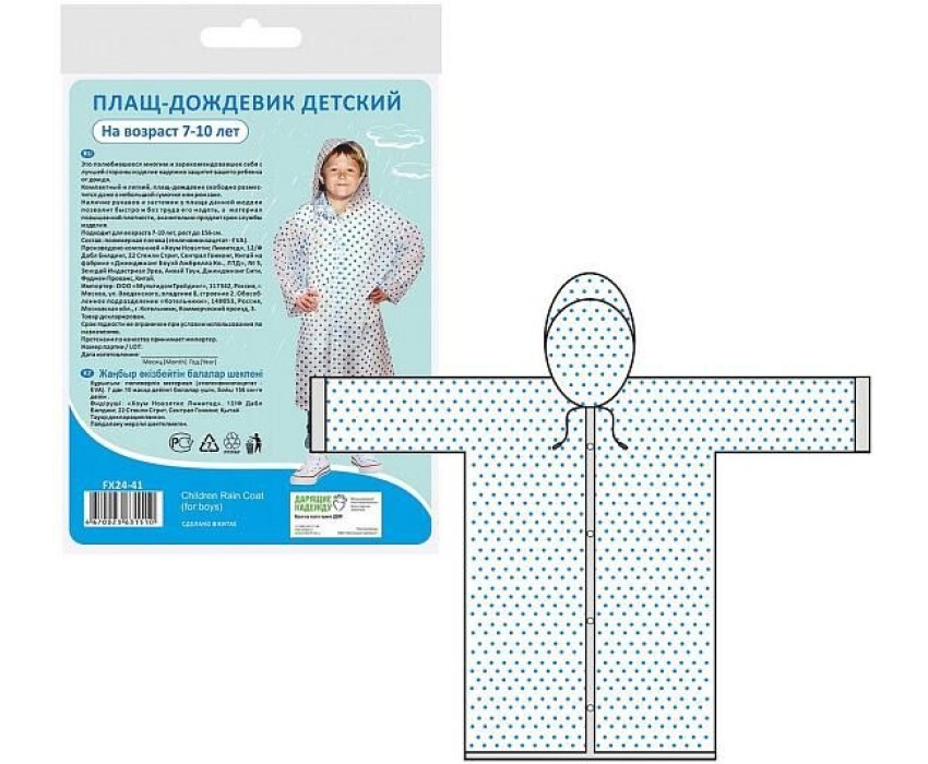 Это полюбившееся многим и зарекомендовавшее себя с лучшей стороны изделие надежно защитит вашего ребенка от дождя.. Компактный и легкий, плащ-дождевик свободно разместится даже в небольшой сумочке или рюкзаке. Наличие рукавов и застежки у плаща данной модели позволит быстро и без труда его надеть, а материал повышенной плотности, значительно продлит срок службы изделия. Подходит для возраста 7-10 лет, рост до 156 см. Состав: полимерная пленка (этиленвинилацетат - EVA).