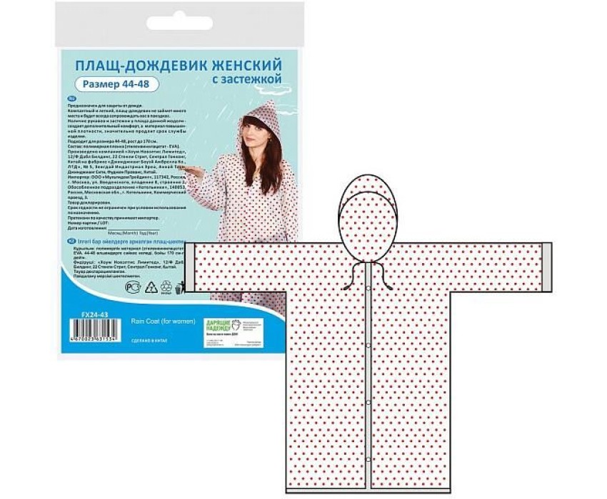 Предназначен для защиты от дождя. Компактный и легкий, плащ-дождевик не займет много места и будет всегда сопровождать вас в поездках. Наличие рукавов и застежки у плаща данной модели - создает дополнительный комфорт, а материал повышенной плотности, значительно продлит срок службы изделия. Подходит для размера 44-48, рост до 170см. Состав: полимерная пленка (этиленвинилацетат - EVA).