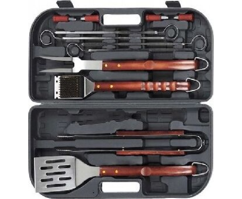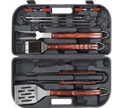 Набор для гриля из 13 предметов обязательно пригодится вам во время отдыха на природе с семьей или друзьями. С помощью приспособлений, входящих в комплект, вы сможете приготовить замечательные блюда на гриле или мангале на свежем воздухе. Все предметы умещаются в удобный пластиковый чемоданчик, который можно в любой момент взять с собой. Комплектация: лопатка для гриля (48,5х9 см); щипцы для гриля (45х2,8 см); вилка для гриля (48,5х4 см); щетка для гриля (44,5х7 см); шампуры (38,5х0,5 см – 4 штуки); вилка для кукурузы (6х2 см – 4 штуки); пластиковый чемодан,Материал изделий: нержавеющая сталь + деревянные ручки,Размер индивидуальной упаковки (чемоданчик): 54x25,5x42см,