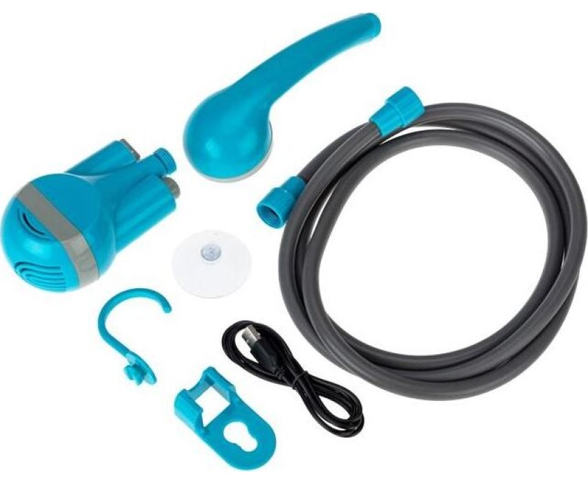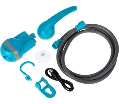 В комплектацию входят: блок питания, водяной насос, насадка для душа, шланг, зарядный кабель, держатель, крючок, присоска.
