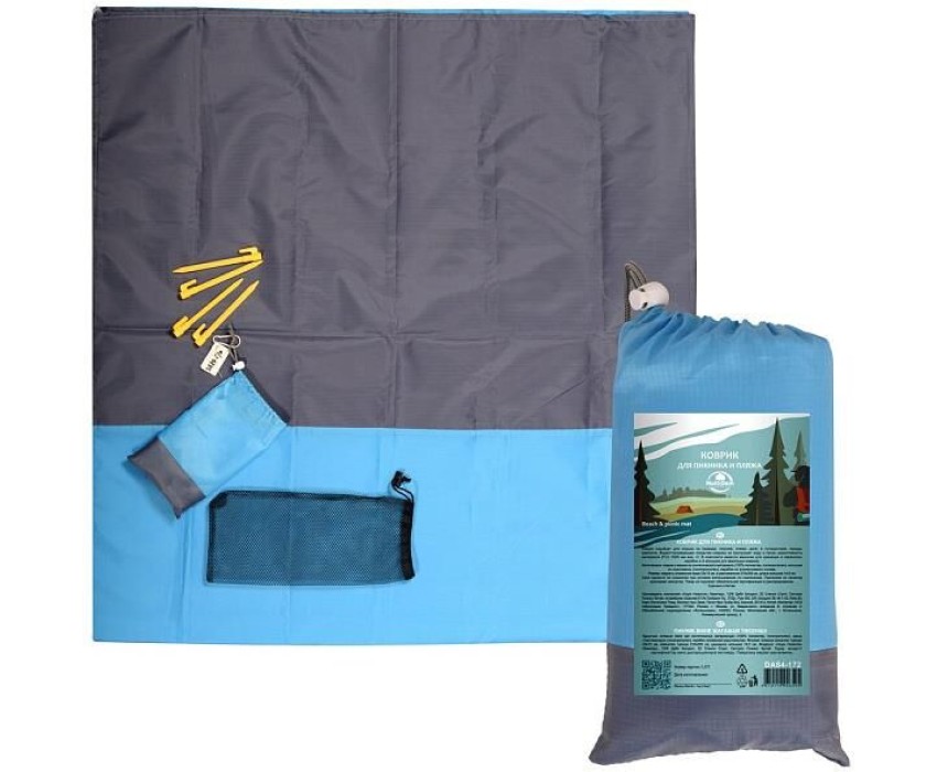 Коврик подойдет для отдыха на природе, пикнике, пляже, даче, в путешествии, походе, кемпинге. Водоотталкивающее покрытие коврика не пропускает воду и песок, водостойкость материала (PU): 3000 мм вод. ст. В комплекте имеется мешочек для хранения и переноски, карабин и 4 колышка для фиксации коврика. Изготовлено: коврик и мешок из синтетического материала (100% полиэстер, полипропилен), колышки из пластмассы (полипропилен), карабин из алюминиевого сплава. Размер: коврик в сложенном виде 23х13 см, в разложенном 210х200 см, длина колышка 14,5см.