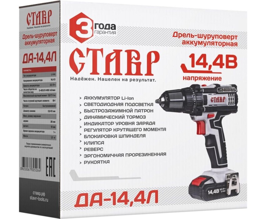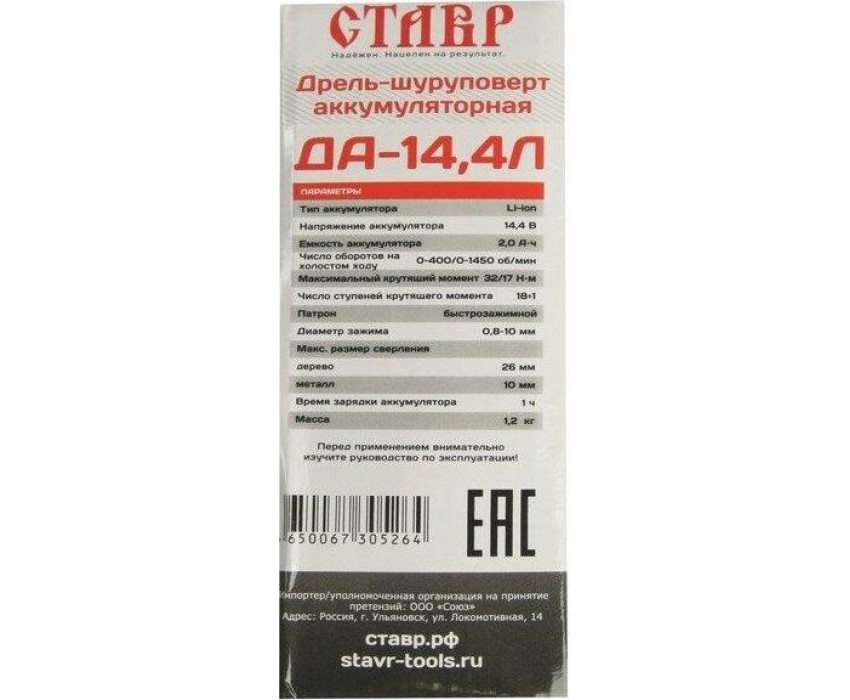 СТАВР ДА-14,4Л (10шт) Дрель-шуруповерт аккумуляторная 14,4 Вольт, 0-400/ 0-1450 об/мин, 32/17 Нм, 2 Ач(Li-on), реверс, 2 скорости, зарядка 1час, подсветка, быстрозажимной патрон 0,8-10мм, число ступеней крутящего момента 18+1