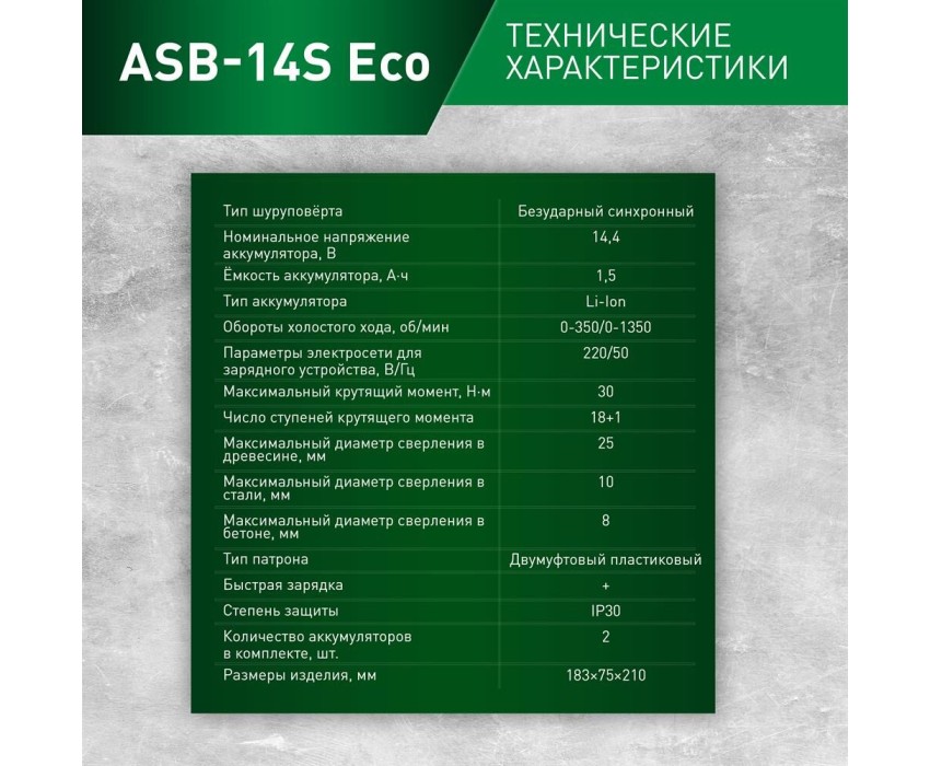 Тип шуруповёрта безударный синхронный Номинальное напряжение аккумулятора, В 14,4 Ёмкость аккумулятора, А·ч 1,5 Тип аккумулятора Li-Ion Обороты холостого хода, об/мин 0-350/0-1350 Параметры электросети для зарядного устройства, В/Гц 220/50 Максимальный крутящий момент, Н·м 30 Число ступеней крутящего момента 18+1 Максимальный диаметр сверления в древесине, мм 25 Максимальный диаметр сверления в стали, мм 10 Максимальный диаметр сверления в бетоне, мм 8 Тип патрона двумуфтовый пластиковый патрон Степень защиты IP30 Количество аккумуляторов в комплекте, шт. 2 Размеры изделия, мм 183×75×210