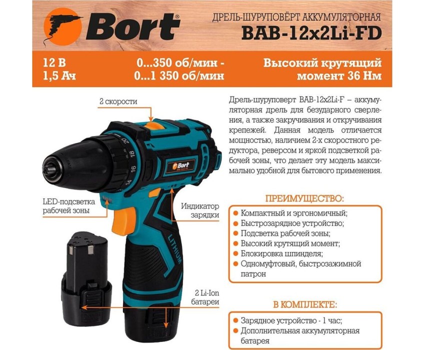 Аккумуляторная дрель BORT BAB-12X2LI-FD (2X1,5 AH)