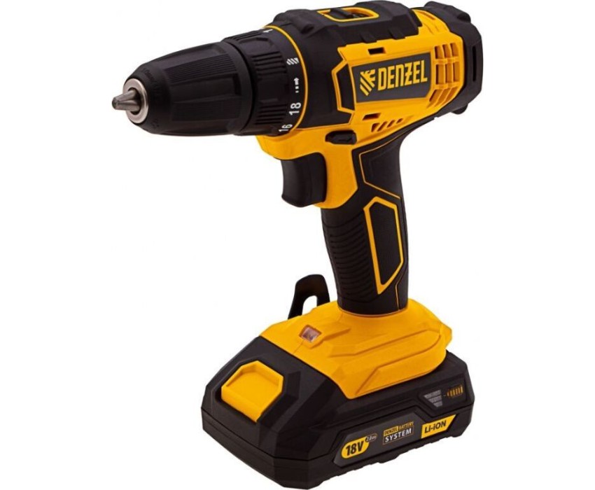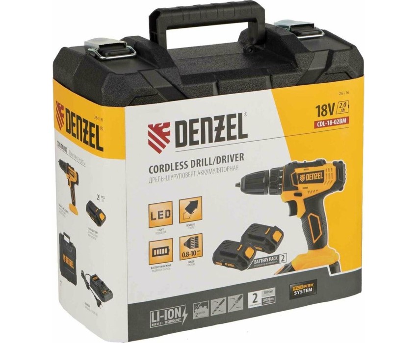 Дрель аккумуляторная DENZEL CDL-18-02BM Дрель-шуруповерт аккумуляторная , LI-ION, 18 В, 2 аккумулятор 26116