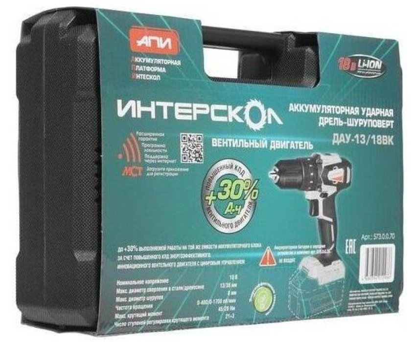 Дрель-шуруповерт ИНТЕРСКОЛ ДАУ-13/18ВК бесщеточная удар. аккум. дрель-шуруп. Li-ion АПИ (кейс, без аккум. и ЗУ)