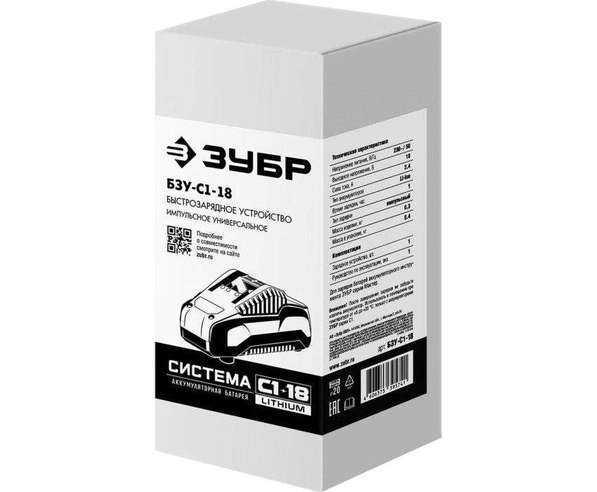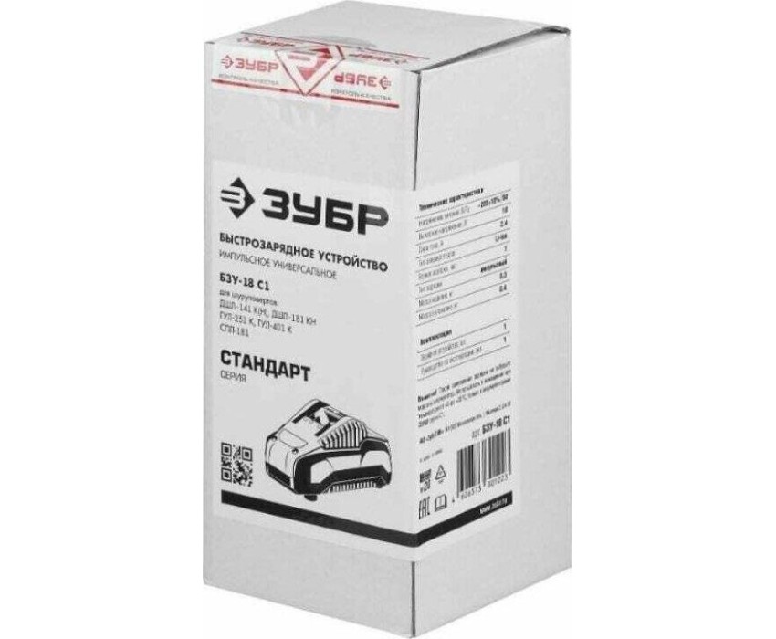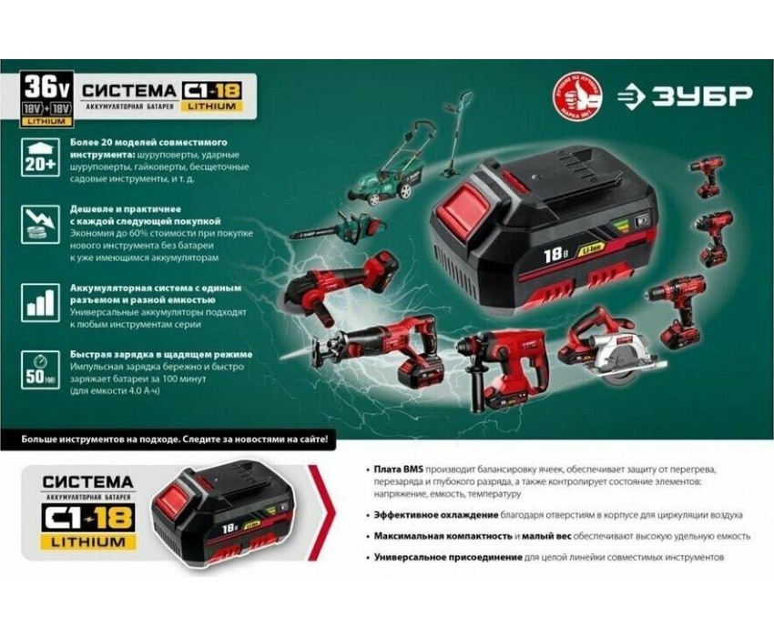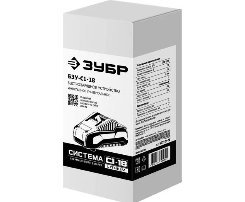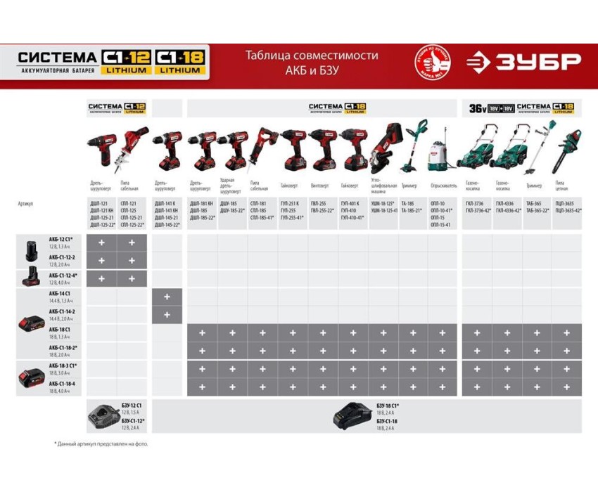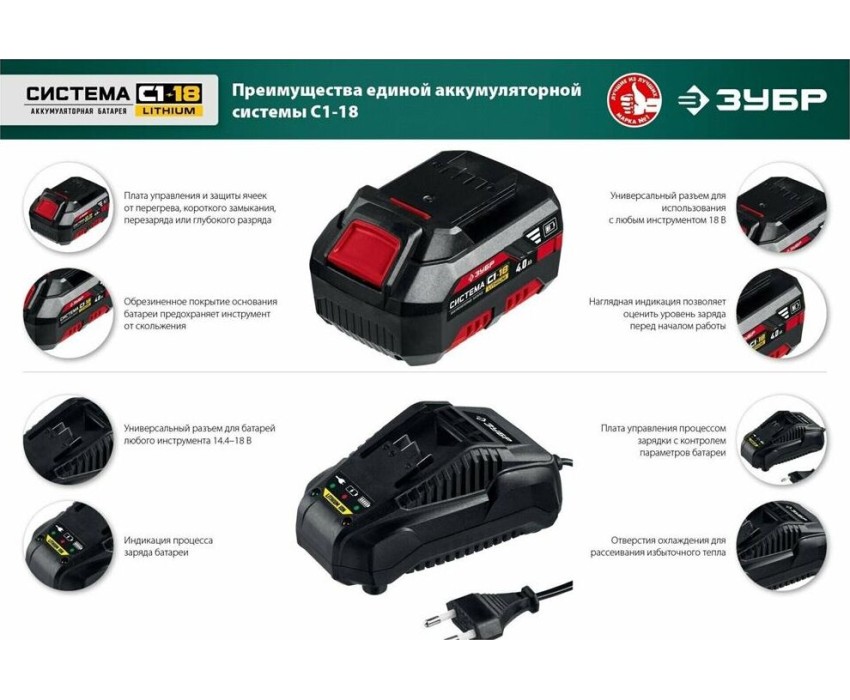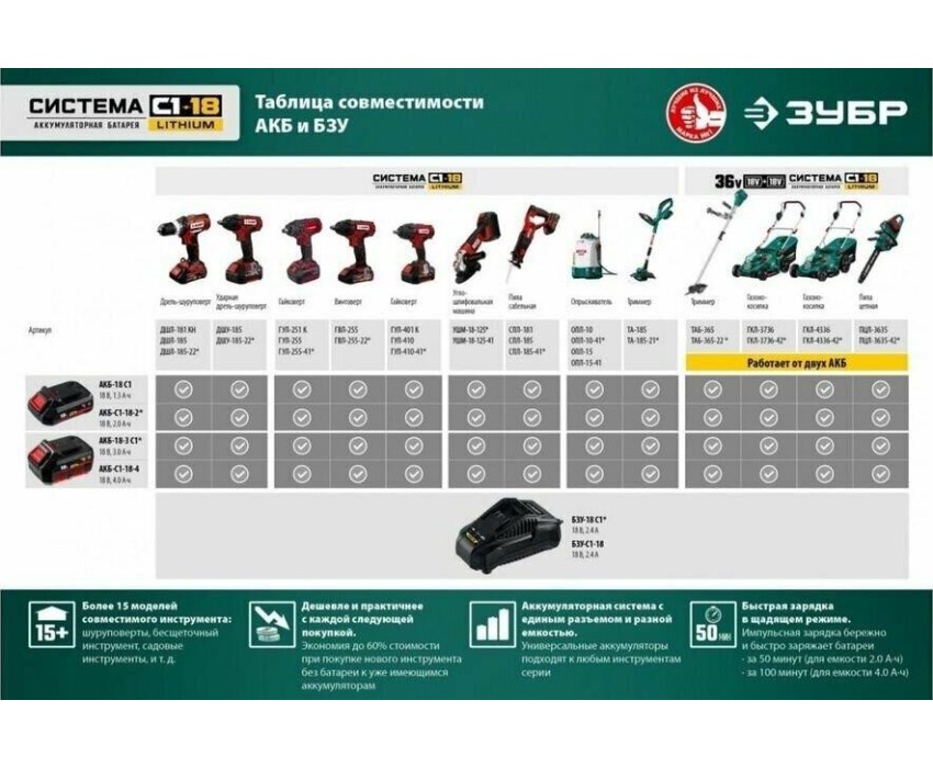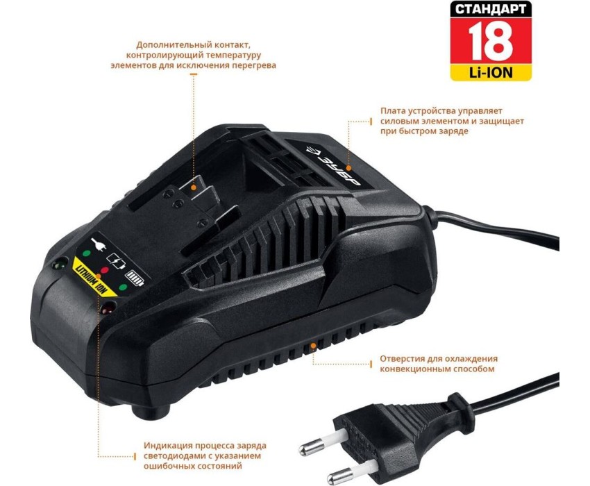 поддерживаемые артикулы аккумуляторов: ЗУБР АКБ-С1-14-2, АКБ-С1-18-2, АКБ-С1-18-4