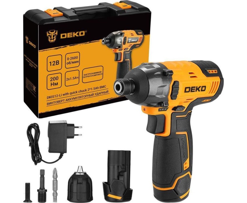 Винтоверт аккумуляторный ударный DEKO DKIS12-Li, с быстрозажимным патроном, 12В, 2*1.5Ач, в кейсе 063-4390