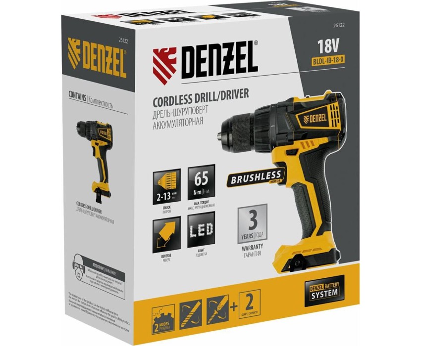 Аккумуляторная дрель DENZEL Дрельшуруповерт аккумуляторная, бесщет. BLDLIB180, LiIon, 18 В Denzel 26122 (Без АКБ)