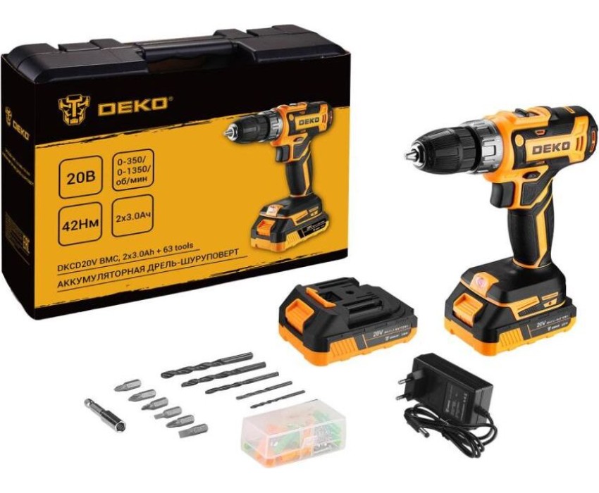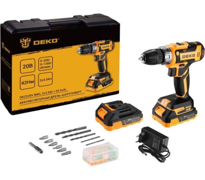 Аккумуляторная дрель-шуруповерт DEKO DKCD20V в кейсе + набор 63 инструмента для дома, 20В, 2х3.0Ач 080-1009