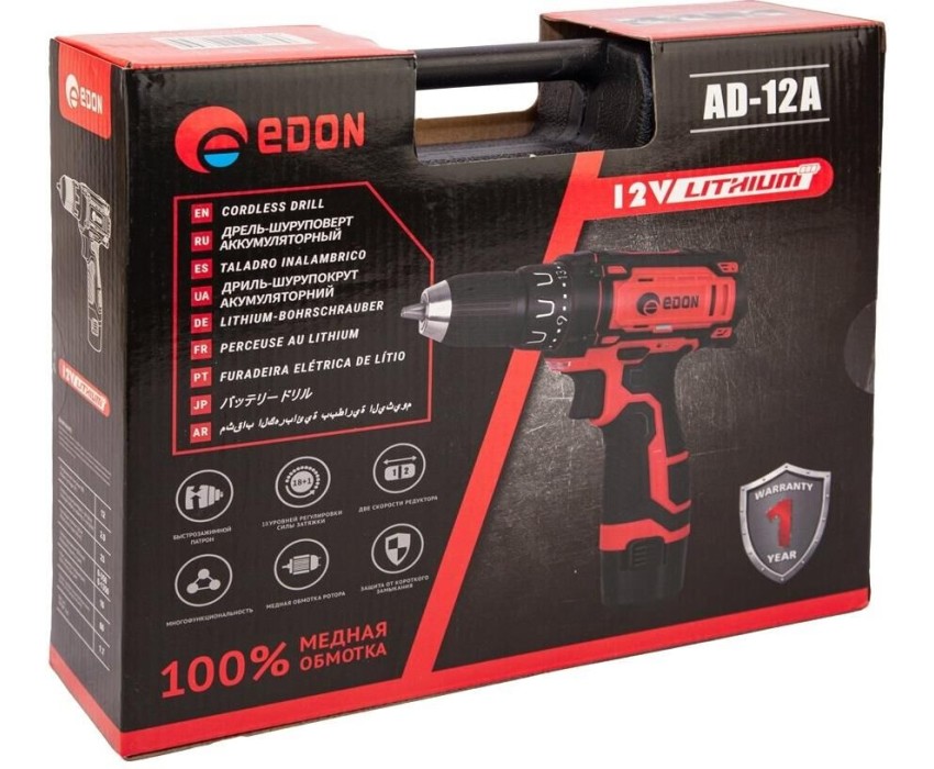Дрель-шуруповёрт EDON AD-12А черный/красный 15420 12В, 2аккум
