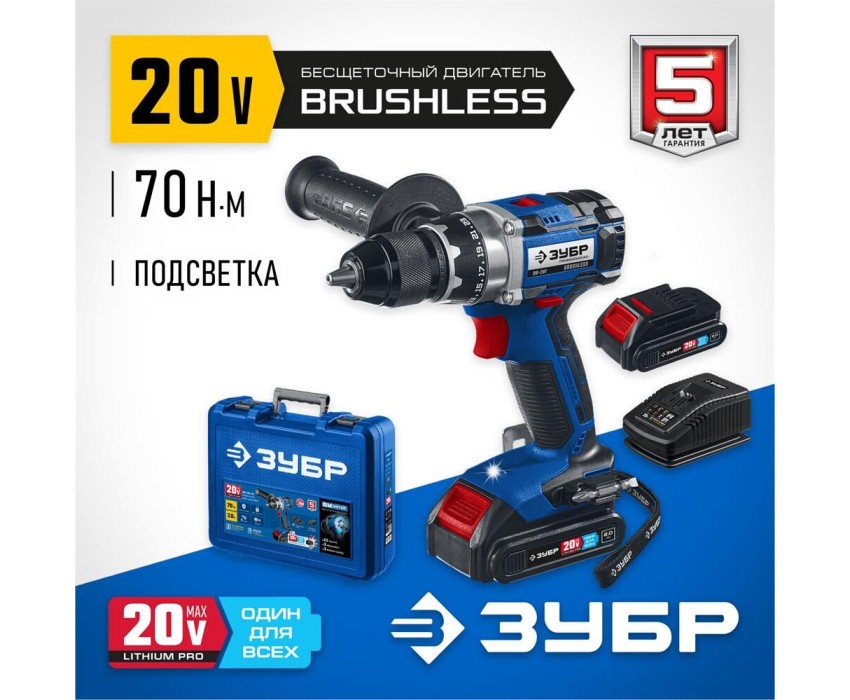 Дрель ЗУБР DB-201 20В, без АКБ, бесщеточный