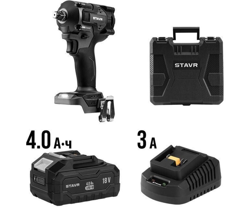 Гайковерт ударный аккум, 380Нм, BL, 18V UNI-M, Stavr SWI 18BL-380V-1К, 1/2", 2 режима, момент срыва 600Нм, 1900/2600об/мин (АКБ 4.0Ач, ЗУ, кейс)