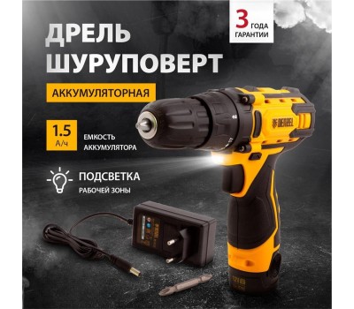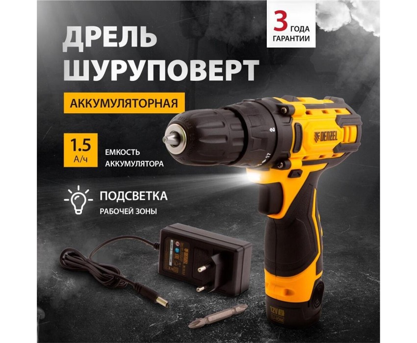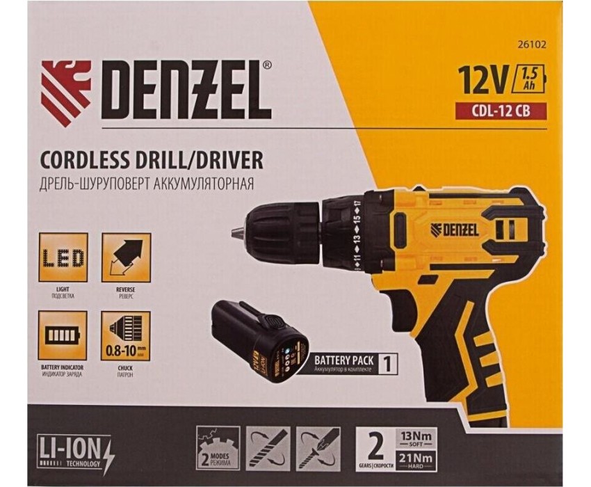 Аккумуляторная дрель-шуруповерт Denzel CDL-12CB 26102 с батареей Li-Ion 12 В предназначена для монтажа и демонтажа резьбовых соединений, сверления отверстий в металле (до 10 мм), древесине (до 16 мм), пластмассе и других материалах. Инструмент пригодится профессионалам и любителям на строительной площадке, дома или на даче.Надежный литий-ионный аккумулятор без эффекта памяти обеспечивает долгий срок службы инструмента. Дрель не зависит от сети питания, что делает удобной работу на строительных объектах, на высоте и в отдаленных участках дома.Преимущества17+1 ступень регулировки крутящего момента — Вы с легкостью подберете оптимальное усилие затяжки под тип крепежа.Два режима вращения — можно настроить скорость в диапазоне 0-400 или 0-1450 об/мин для работы с резьбовыми крепежами и сверления отверстий.Мгновенное переключение между задачами — реверс позволяет быстро перейти от монтажа к демонтажу крепежных элементов.Подсветка рабочей зоны — решать поставленные задачи удобно даже в условиях плохой освещенности и в труднодоступных местах.Защита от перетягивания крепежа — благодаря тормозу выбега шпиндель моментально останавливается после выключения.Высокий ресурс — корпус из ударопрочного пластика и металлические шестерни редуктора обеспечивают долгий срок службы инструмента.Быстрая и безопасная зарядка — на восстановление работоспособности аккумулятора требуется всего 1 час.Индикация уровня заряда — можно вовремя зарядить батарею, избежав перерывов в работе.Комфортная эксплуата…